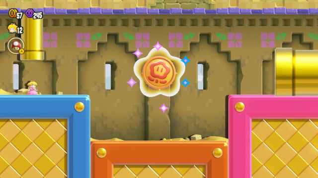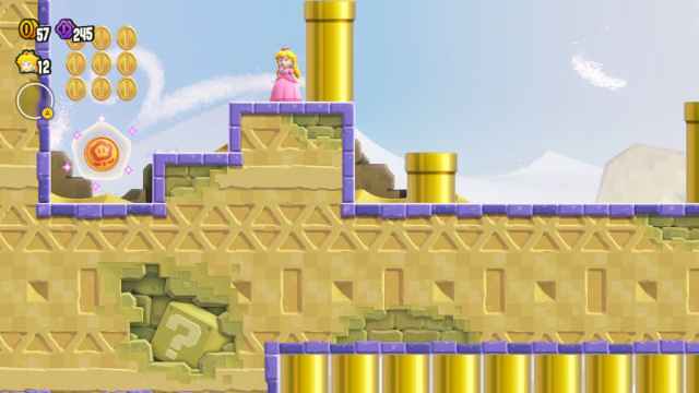 For the first hidden Wonder Token, you’ll want to head to the top of the level on the left side. Simply jump on the floating platforms past the first set of golden pipes. Once you reach the top, there will be a pipe that you can push. Move it as far left as you can. Jump on it, then jump over the tall pipe on the ledge. The token will be on the other side.