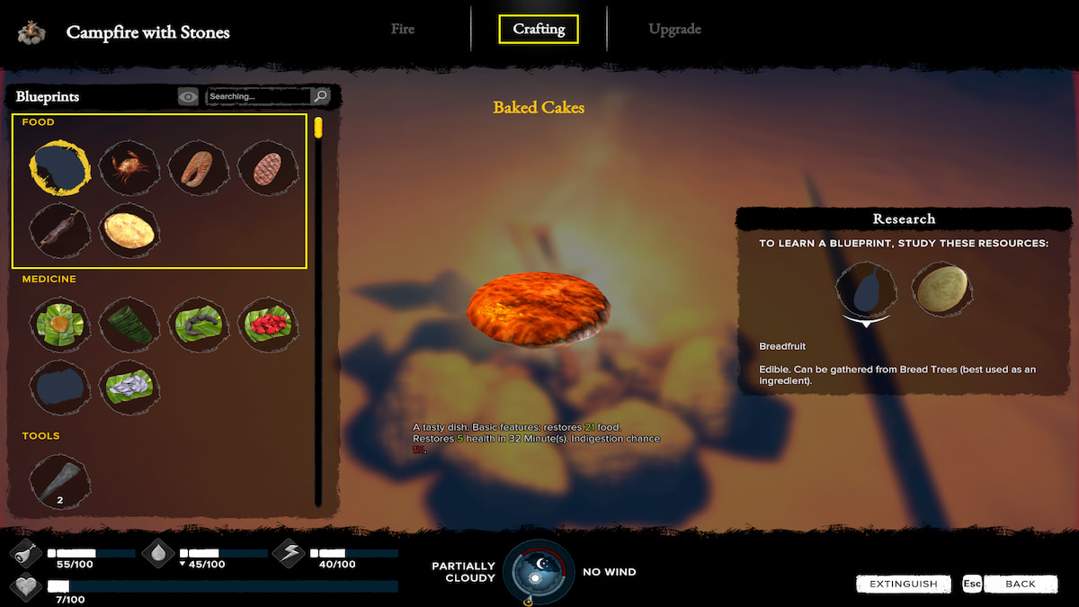 Once you have a campfire or cooking station placed, interact with it and switch to the Crafting tab. You’ll see the Food category at the top of the Crafting list. You can select the recipe you want to make and cook it if you have the proper ingredients.