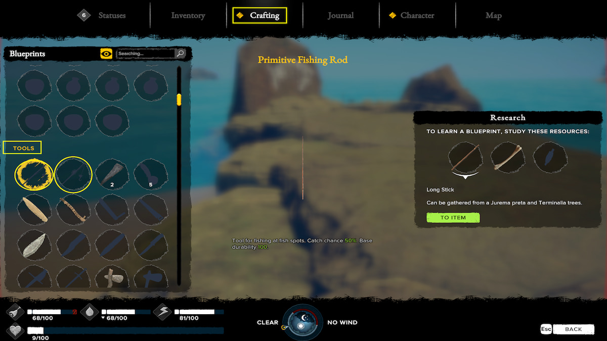 Open your Crafting menu and scroll down to the Tools category. In this category, you’ll have two fishing poles you can craft: the Primitive Fishing Rod and the Improved Fishing Rod. You’ll need a few different types of materials to make them.