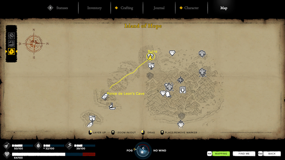 From the Ponce de Leon’s cave, continue through the cave to the opposite side (past the lit brazier). Then, continue northeast toward the jungly tree area. If you take the time to map out the area first in your Map menu, there will be a diamond icon on your map at the location you want to go. If not, keep heading in the same northeast direction, passing the Cartographer tree on your right, and you’ll eventually find some ruins.
