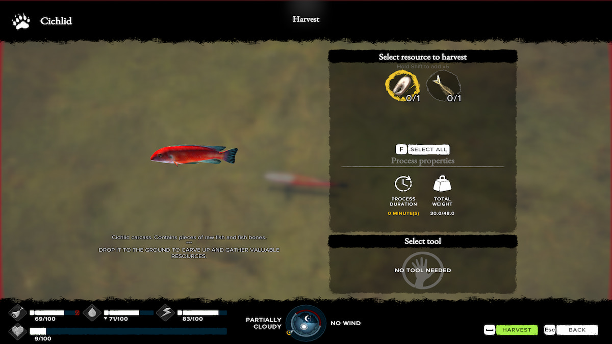 You’ll catch random fish each time you start the fishing process. You may find rarer fish species depending on what bait you are using and what fishing spot you are at. The fish you catch can be used as food or as crafting materials (with their bones). To gather the ingredients from it, drop the fish carcass on the ground and then Interact with it to harvest the materials.