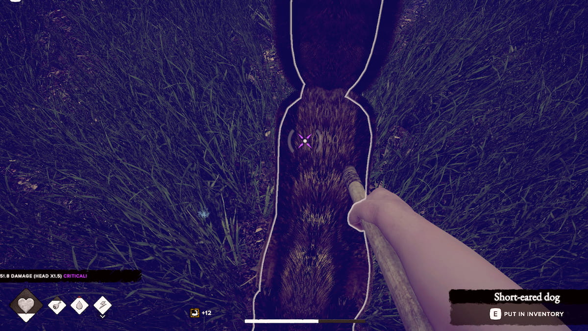 Aiming for the head will do more damage than a body hit. Aim your shot by placing the two curved cursors over the animal. However, if you want your hit to be most effective, you’ll want to charge up your swing by holding M1 until the cursor meter fills up to the red. Then, release M1 to perform your attack.