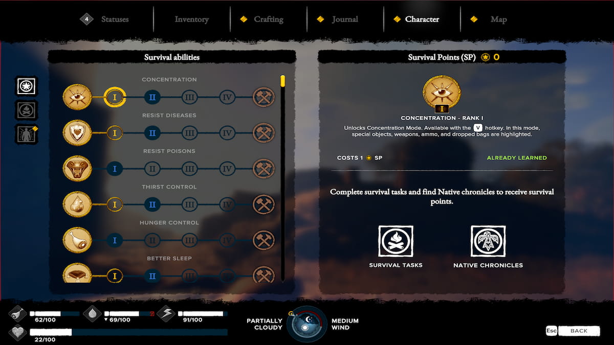 You can unlock the Concentration skill within the Character menu under Survival Skills. Using a Survival Point, earned through completing survival tasks or locating a chronicle, you can unlock different levels of the Concentration skill. The first level will allow you to start using the ability by pressing V on your keyboard. It will only last briefly, but you can keep reactivating it. The higher the skill you unlock, the more you can see.