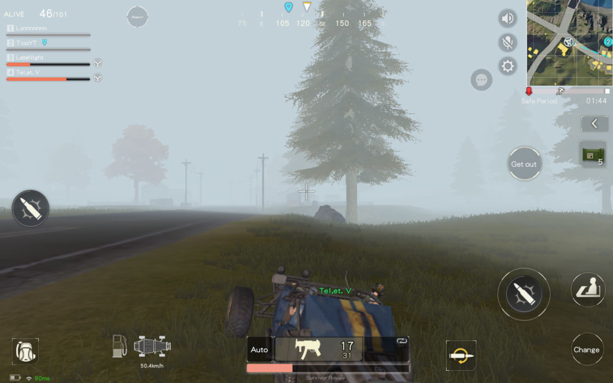 If you are in Squad mode and working with other players, cars are your best friend. Choose to ride instead of drive, then tap the button on the right side to lean out the car and pull out your primary gun. A caravan of vehicles working together and spraying bullets is hard to take down by lone wolves running across open terrain. Just keep in mind that the vehicle handling is atrocious — give yourself plenty of room for turns!