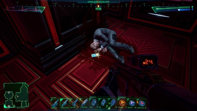 Once again, return to Executive, and this time, go northeast from the elevator to Maintenance. Retrieve the Admin keycard, which is found next to a dead guy in the dining room.