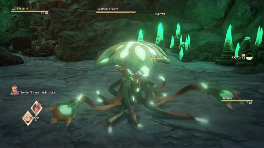 If you haven’t been paying attention to enemy names thus far, Ropers are the giant green things that resemble glowing green squids. Ropers are weak to wind, so Rinwell’s base wind spell and Alphen’s Severing Wind arte should serve you well.