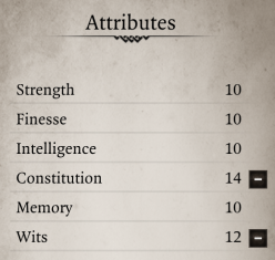 Constitution is obviously important for not dying, but Wits provides Initiative — a vital stat for Tactician mode. As the initial combat round will shape the flow of the fight, you’ll want to go first whenever possible. 12 Constitution should be enough to start out with if you want to throw a few points elsewhere, but you’ll want to bump it up to 14 pretty early on.