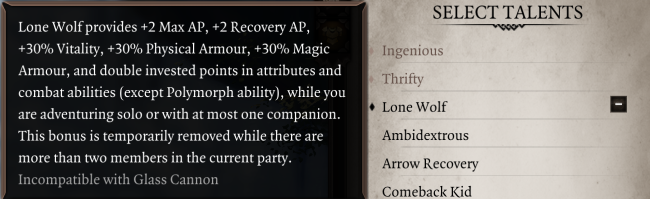 The Lone Wolf talent doesn’t restrict you to just one character in your party, and you’ll be able to have at most one other companion with you. But bear in mind that a party of two will need to employ a very different set of tactics than a party of four will.