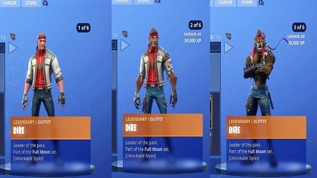 The most challenging skin to get this season at Tier 100 is also one of the best Halloween skins available. Dire is a legendary skin that at first just looks like a jock teenager. But after unlocking his other styles, this skin transforms into a terrifying werewolf.