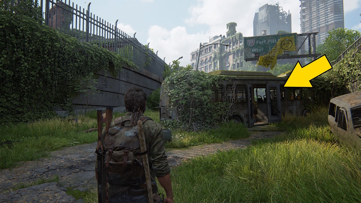 After leaving the initial area through the garage, you’ll find yourself on a road that leads to the main section. The collectible is inside the wreckage of a bus.
