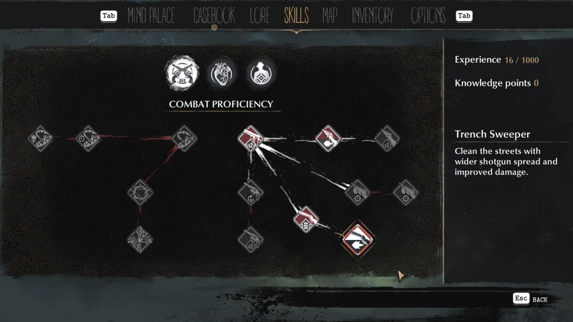 - Trench Sweeper: Combined with Tight Spring, these are hands down the two best combat skills. Since shotgun shells are easier to craft than SMG bullets and are far more accurate, this combo makes the shotgun an absolute implement of death for any squamous, tentacled monsters out there hoping to interference in your investigations.