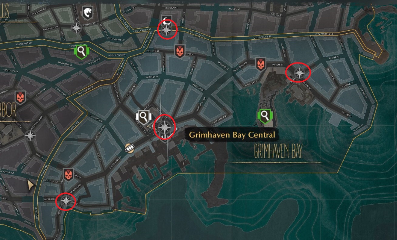 - Grimhaven Bay South: Near the far south edge of the map, this one is at the intersection of Bayside Avenue, Pearl Lane, and Deepshore Road.