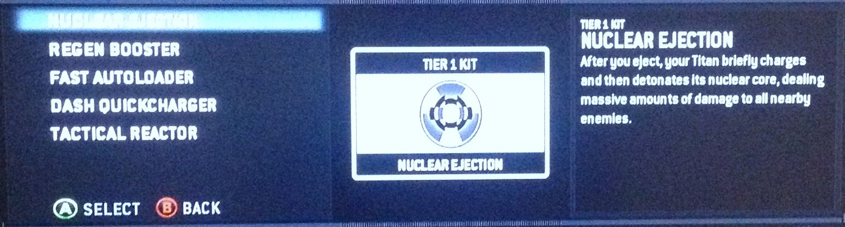 Go out with a bang with the Nuclear Ejection tier kit. When you eject from your Titan, it will cause a nuclear explosion after a short time. It will kill anything that is close enough and seriously damage anything on the edge of the explosion.