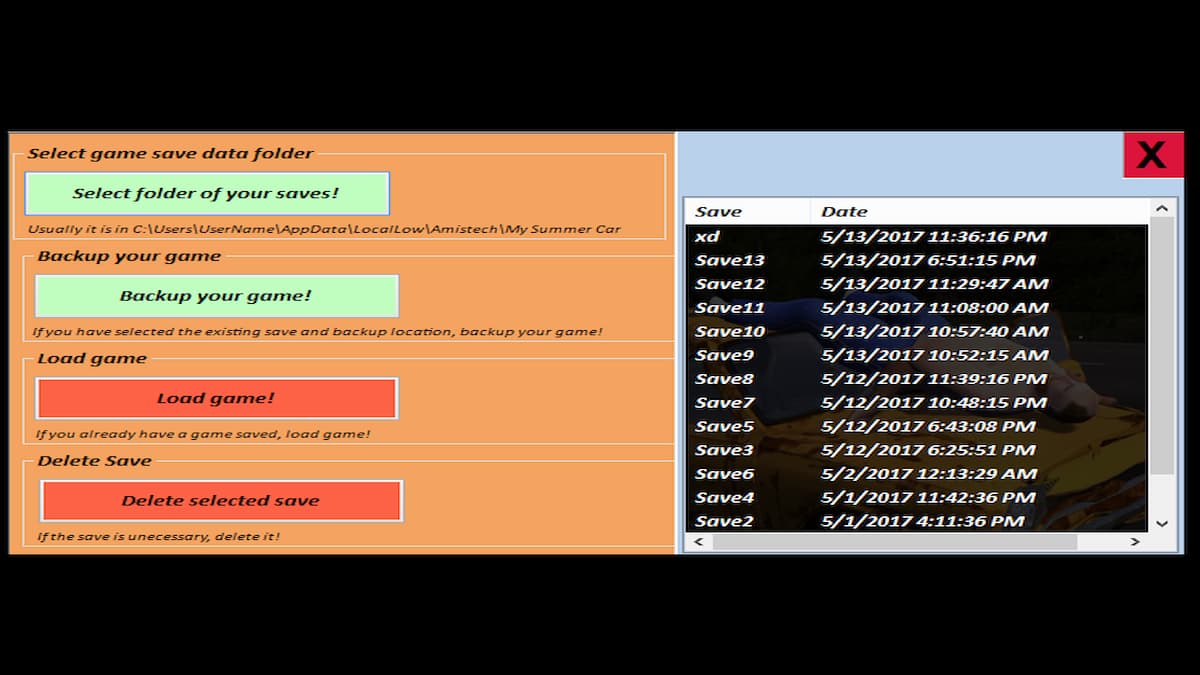 Though shortcuts are nice, the Game Save/Load Bot takes saving games a couple of steps further. Ordinarily, My Summer Car only gives you one save file. This Bot — an external executable — lets you manage several saves at once and choose which one to load at any given time. It’s a truly nice feature if you want to start a new game but don’t want to lose that pretty show car you worked so hard on.