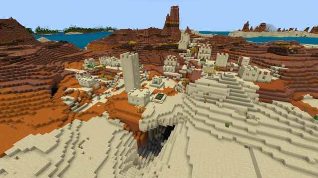 Desert Temples next to hills look more like staircases than the structures they actually are. In this world, Bedrock players will spawn near a Desert Village on top of a hill. Next to the village is a Desert Temple that has merged with the ridge beneath the town. The Temple forms a small staircase leading up to the eastern half of the village. If you aren’t careful, you’ll wind up falling through the top of the temple while walking through the town.
