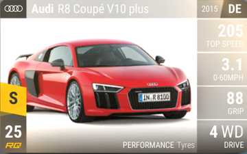 With an acceleration rate of 0-60 MPH in 3.1 seconds, it’s clear that the Audi R8 Coupé V10 is perfect for the 0-100 MPH races. It doesn’t have the best grip of the top spec Audis, but it certainly has the top speed!