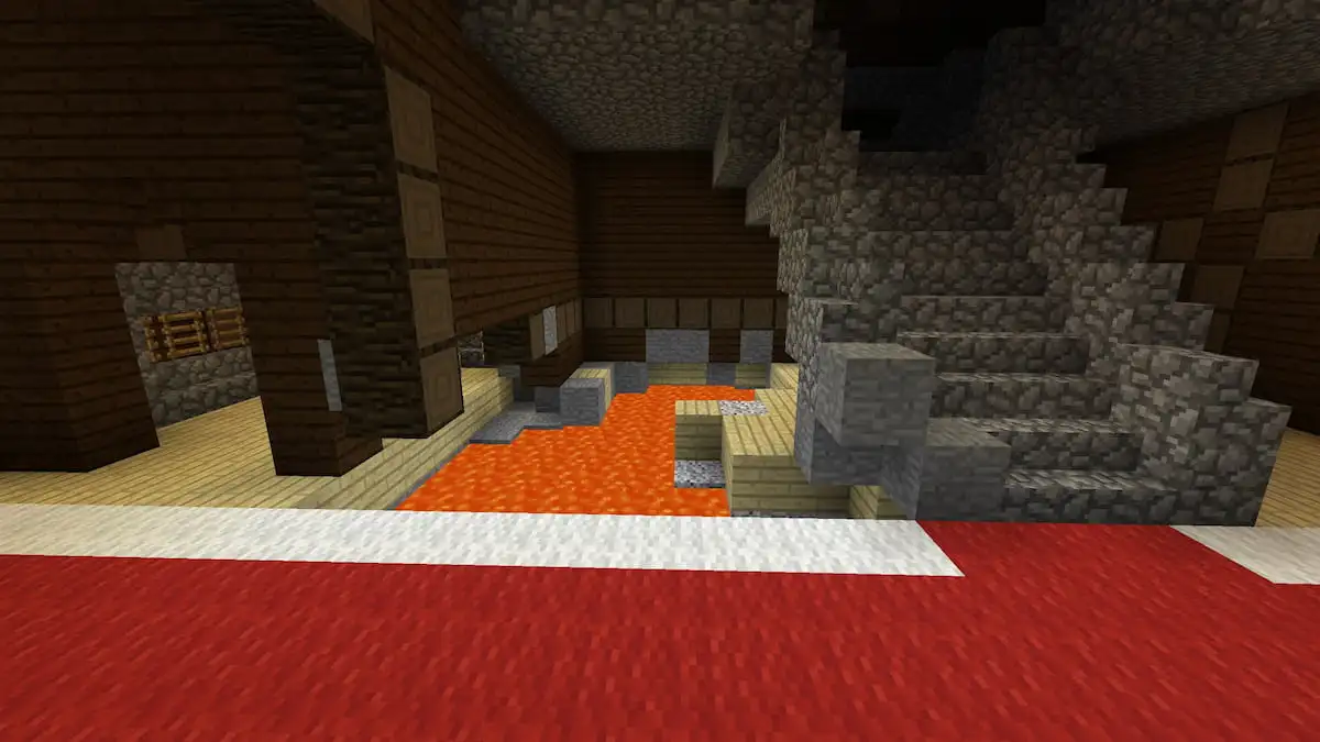 A Minecraft Woodland Mansion with a pool of lava in it's entryway