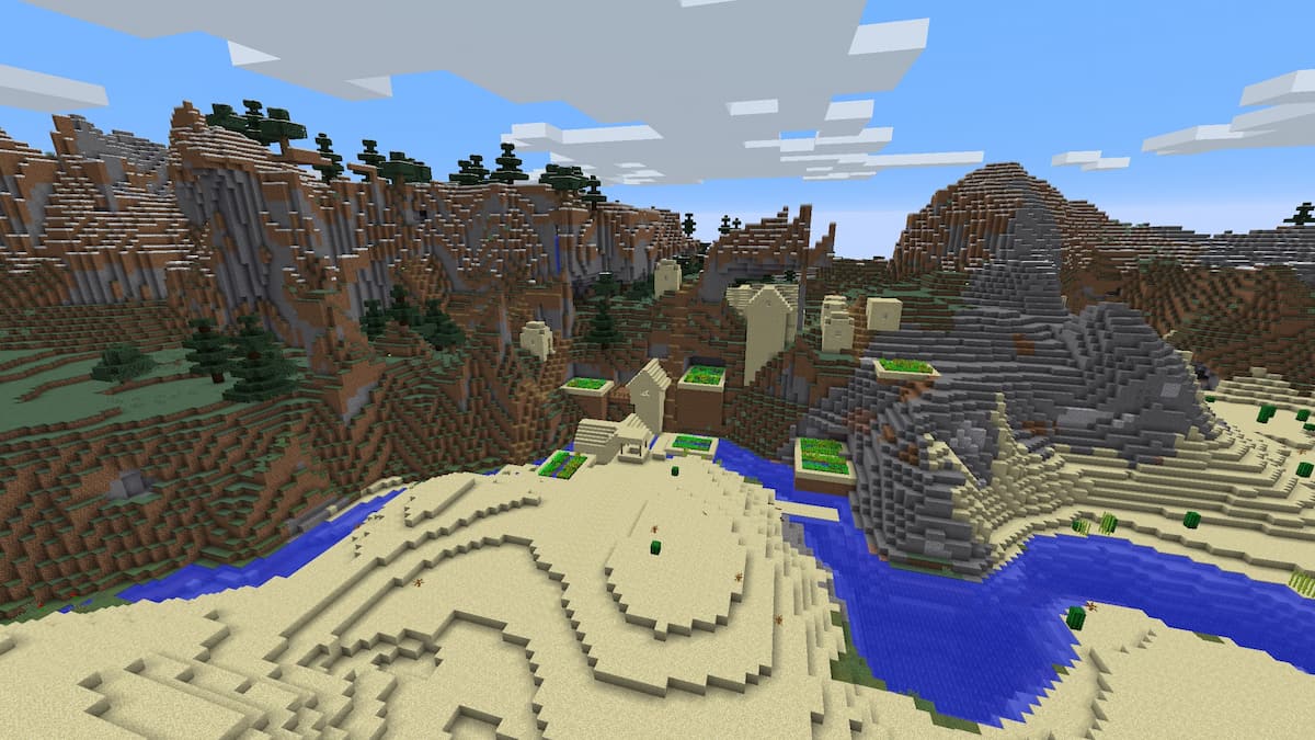 In this seed, a Desert Village spawns on the side of an Extreme Hills biome. The result is a unique-looking village with oddly tall homes and farms! Since this village is close to spawn, you’ll have an easy time visiting it and the Desert Temple next to it. The temple is packed with treasures ranging from iron and emeralds to Golden Apples and horse armor, so make sure to check it out.