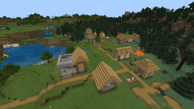 This seed is ideal for a basic survival world because of the three structures around Spawn. To start, you’ll have access to two separate villages, one of which is home to a Blacksmith. You will also be close to a Pillager Outpost between the villages that can be used for farming experience. If you’d like your base to be further away from the Pillagers, there is a third Plains Village further to the north.