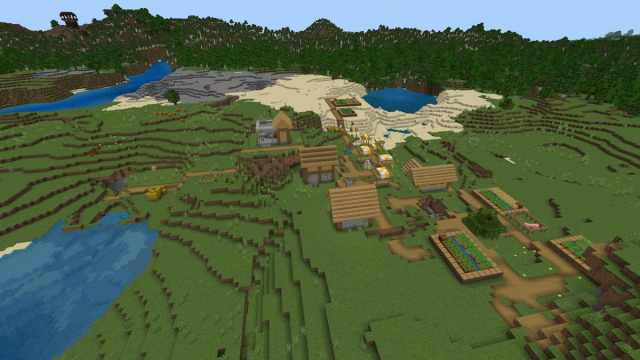 You will spawn in a forest with a village nearby at coordinates 300, -550. This village occupies and entire meadow hill with buildings progressively covering each step of the hill with the blacksmith being the topmost tier.