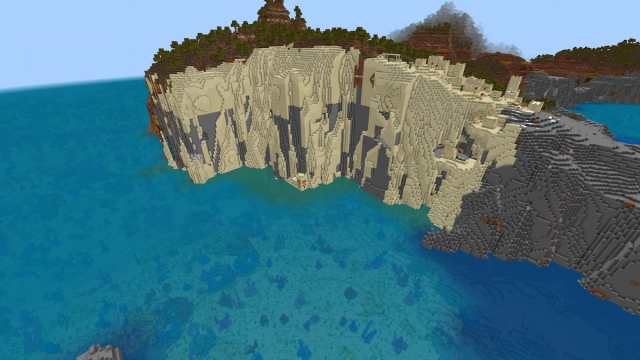 Steep Minecraft cliffs covered in snow by a Frozen Ocean and a Plains Village