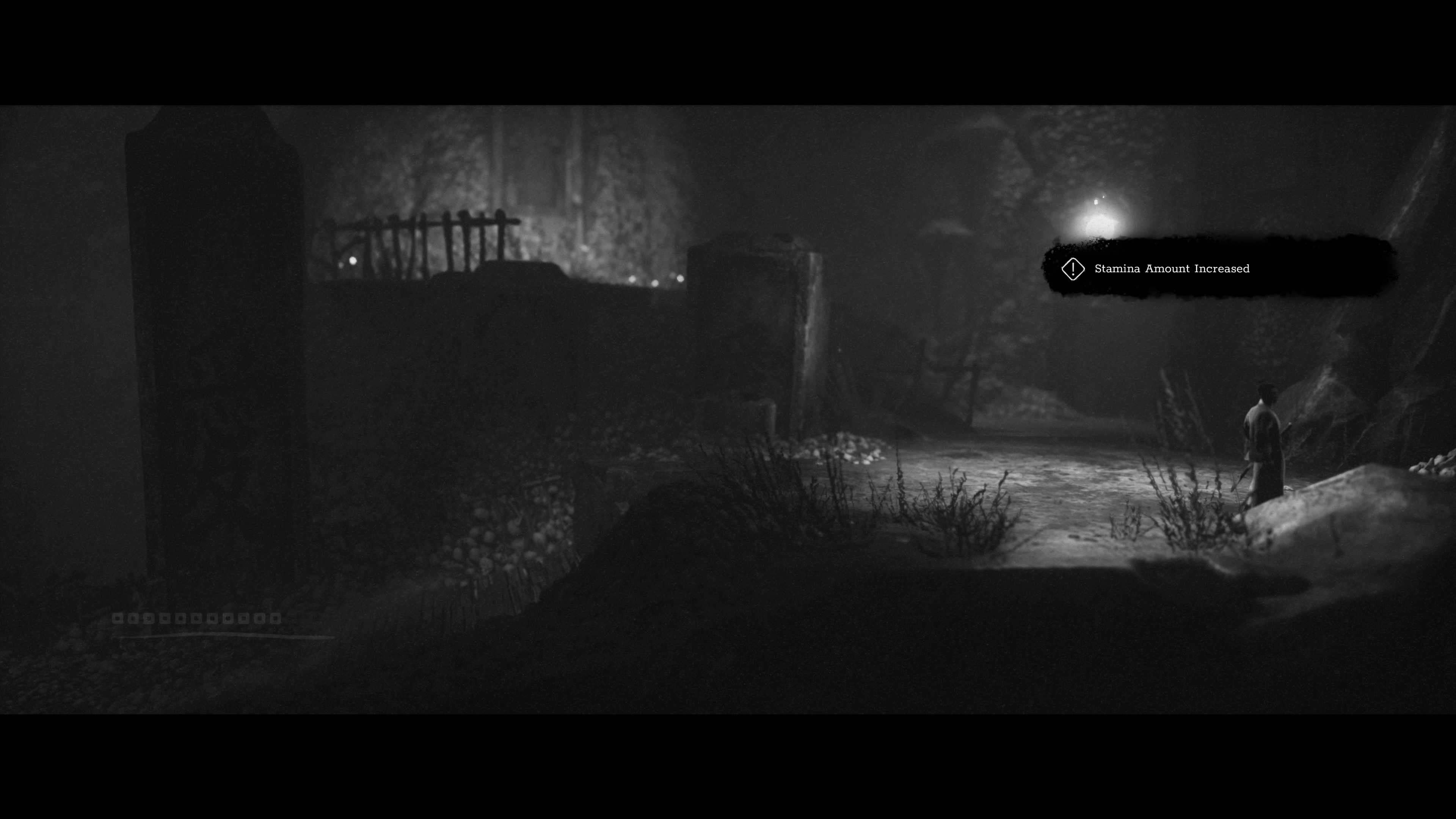 Stamina Upgrade 7 — After the first section where you are being attacked by bandits on horseback, you will come to the same crossroads where you picked up the second Stamina upgrade in Chapter 1. Pass the Shrine again into the graveyard. This time there will only be one screen (and thankfully no enemies), where you will find this one.