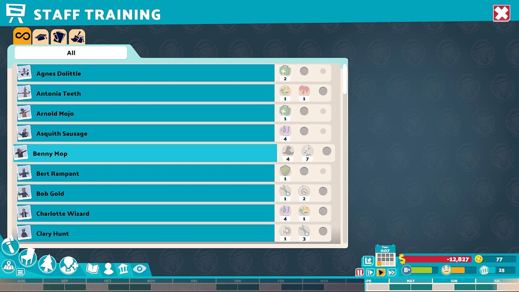The other way to teach staff new tricks is to click on the specific staff member you want to tutor, then select the “Train Staff” button at the bottom of their profile, which looks like a little easel. Lower levels of training only cost a few hundred dollars, but higher levels can easily cost upward of $4,000, so you’ll want to make sure you have plenty of cash in the coffers. Still, you’ll want to make sure you have some kind of continuing education scheduled at all times, so you’re constantly improving your courses and your campus.