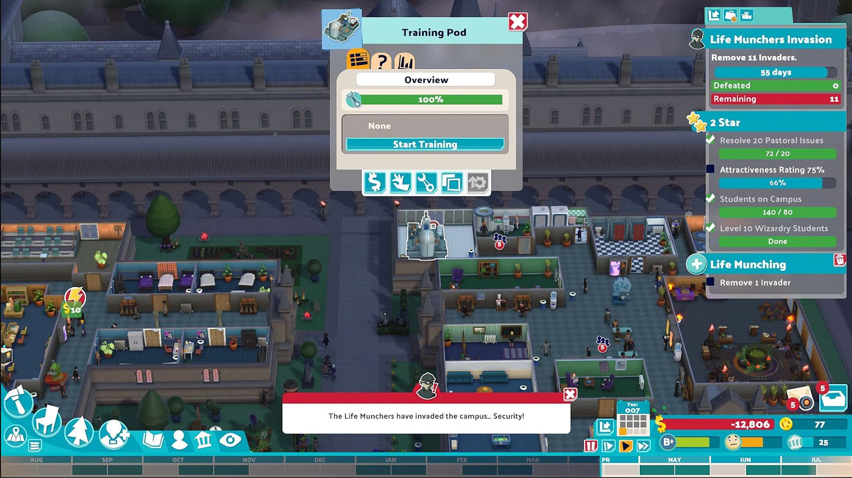 Once you start improving this university, you’ll unlock the training room, which costs a whopping $40,000 to build. To place the room, open the build menu and select a 4×4 area, then make sure the room has a training machine/training pod and a door.