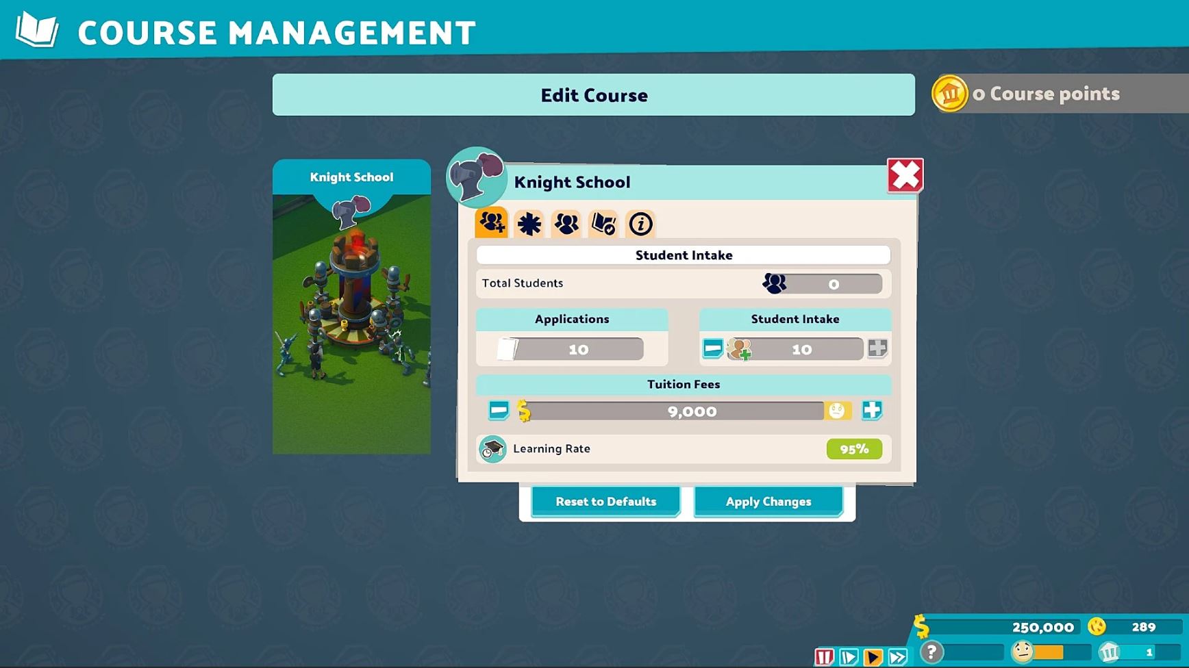 At the end of each year, you can put points into each of your courses, increasing its education level and the number of students able to enroll in that specific track. If you click on the gear icon in the top left of each course in this end-of-year menu, you can adjust tuition rates.