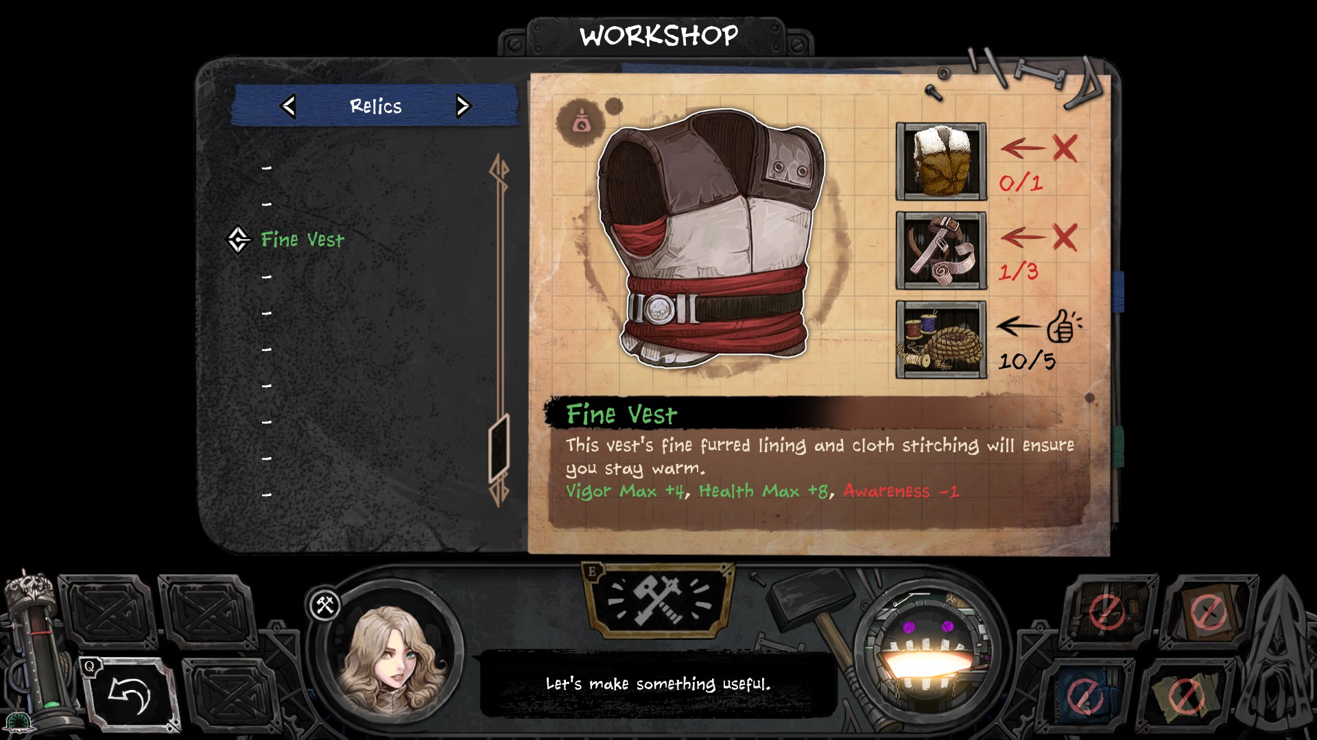When you have the resources, buy a Vest for your three companions, and then craft a Fine Vest for Lyric using these components: