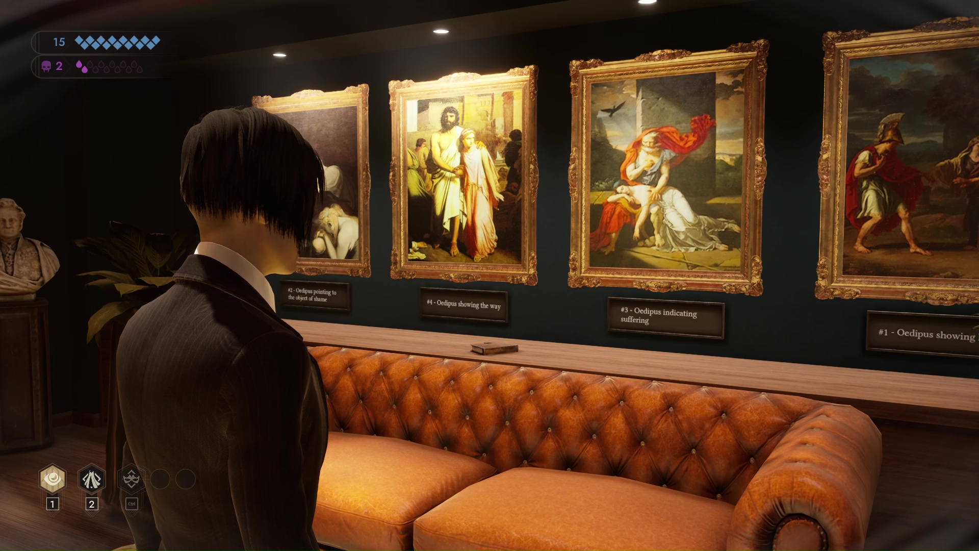 First, look at the Oedipus-themed paintings on the wall nearby, and note that they’re out of order. They’re arranged on the wall as #2, #4, #3, and #1. The caption on #2, “Oedipus pointing to the object of shame,” is another useful clue for the puzzle’s solution.