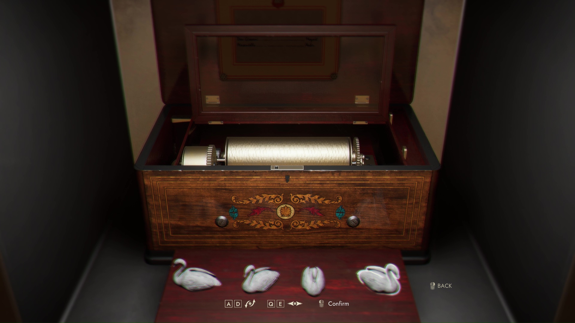 Return to the music box and arrange the four carved swans as such: ←, ⇙, ↓, ⇲ (below). This will complete the puzzle and open the door behind it.