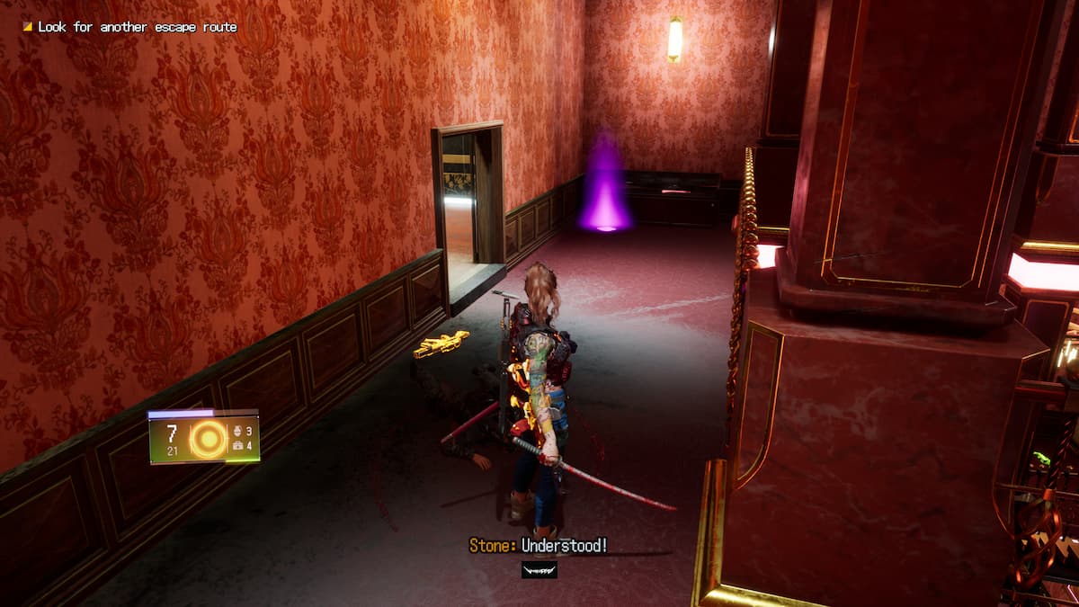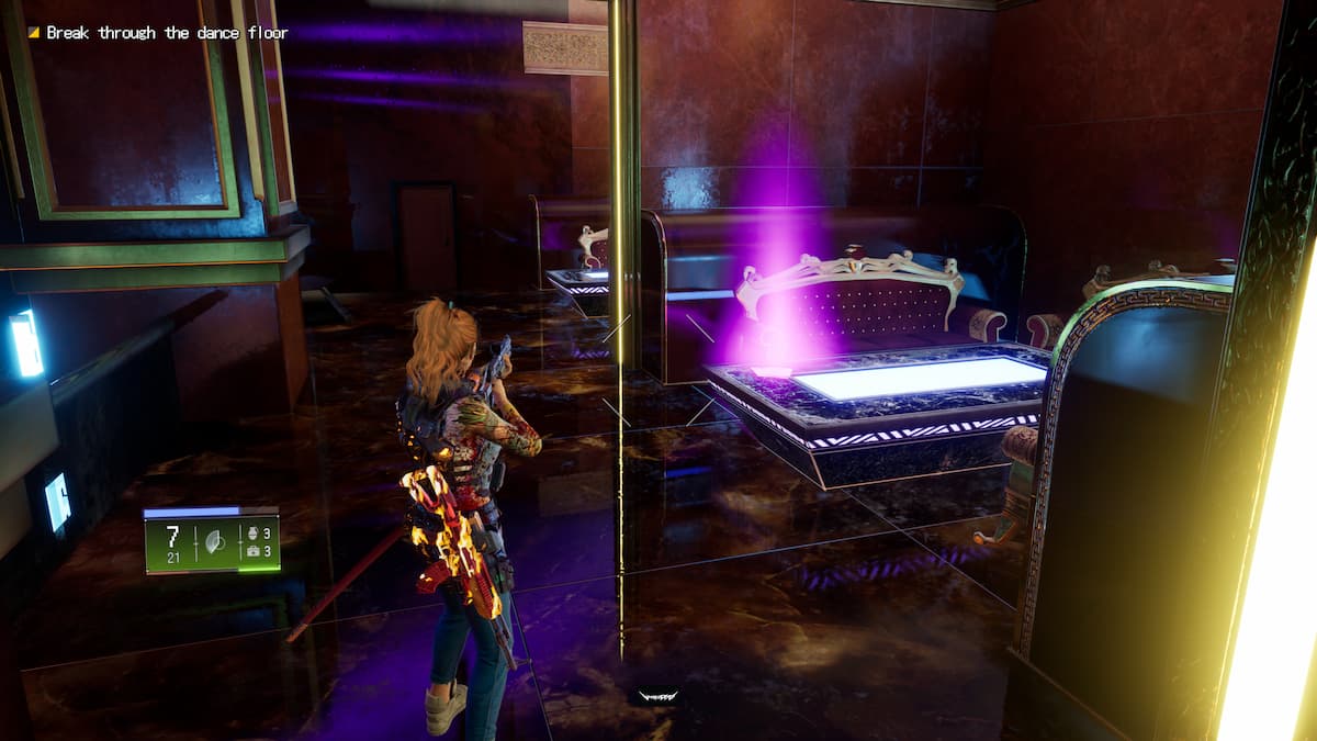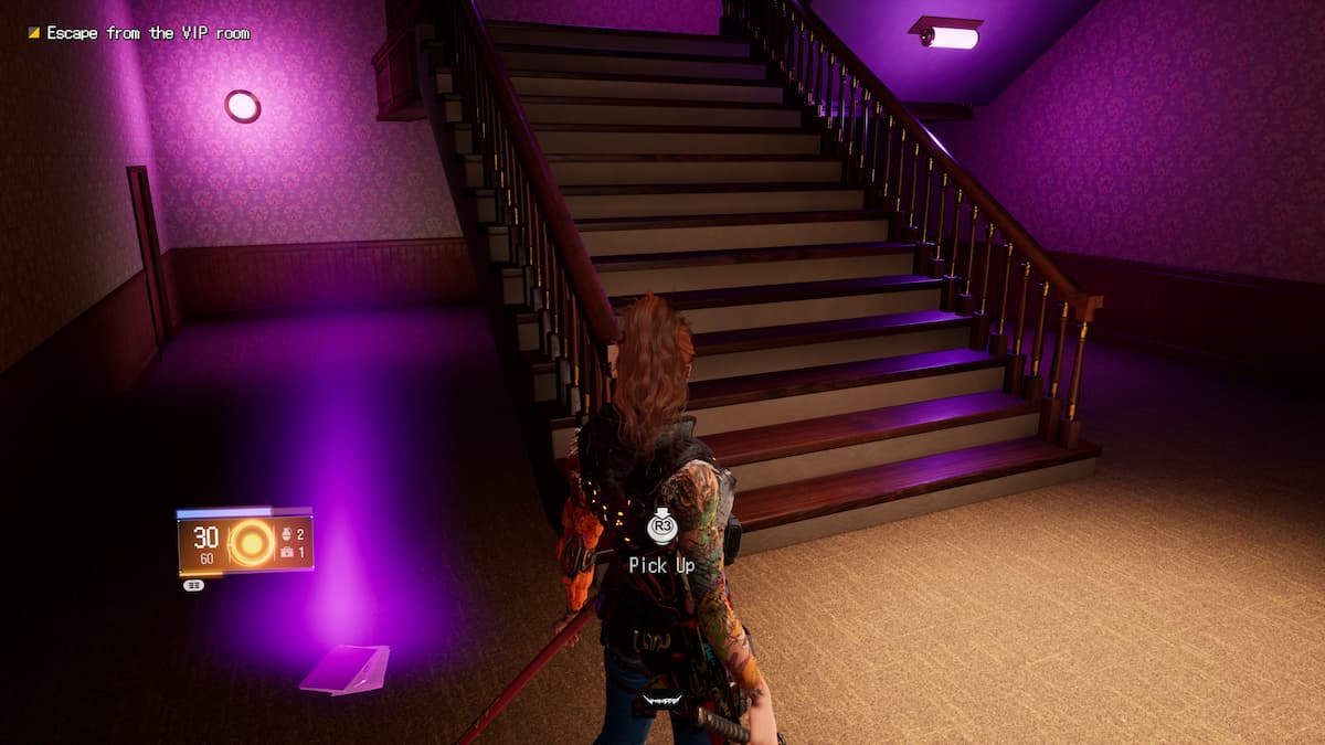Keep moving along the stage until you have to travel down a flight of stairs on the opposite end of the club. You’ll end up passing through a red-carpeted hallway on the first floor. Just past this hallway, an enemy ambush takes place in a dance room with eight support pillars and some light fixtures hanging off the wall directed toward the dance center of the room. After killing everyone, you can find the Club Member’s Card on the podium with the DJ equipment.