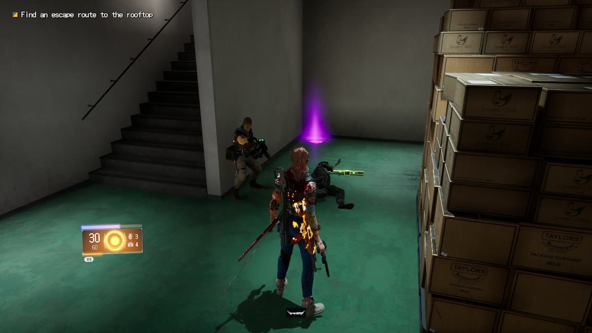 After the next checkpoint, you’ll be funneled through an encounter with two sword-wielding foes in a kitchen followed by multiple gun-toting enemies in the room past the kitchen. This next area looks like some sort of storage room, filled with stacked boxes and a forklift. Before heading upstairs, check out the ground in the corner of the room closest to the staircase. This is where you’ll find Mustafa’s Gang Report 2.