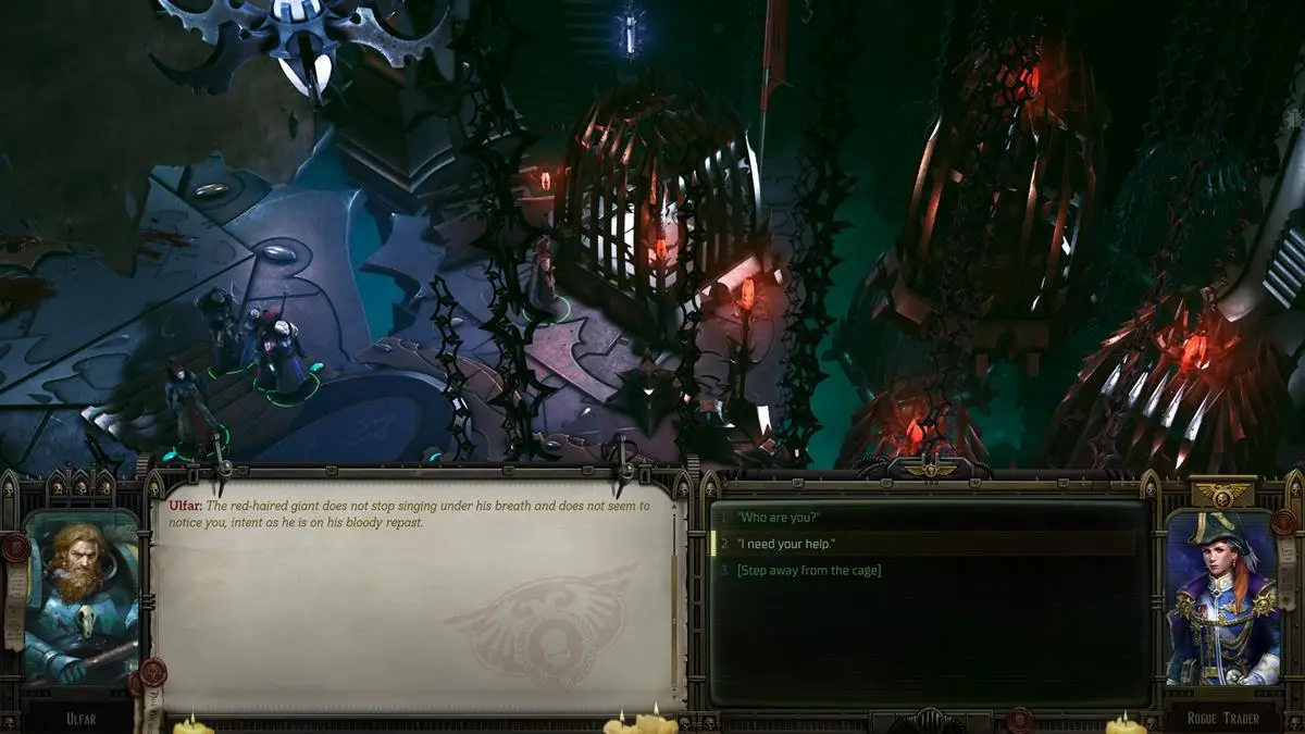 - “I would like to keep the Space Marine you keep in a cage.” — You can convince him to give you a key. This alows you to unlock a cage and recruit a Space Wolf companion named Ulfar.