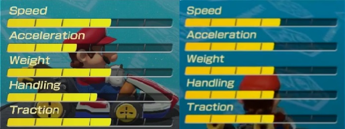 Shown above are the stats screens for Mario’s standard Kart setup with Mario Kart 8 on the left, and Mario Kart 8 Deluxe on the right.