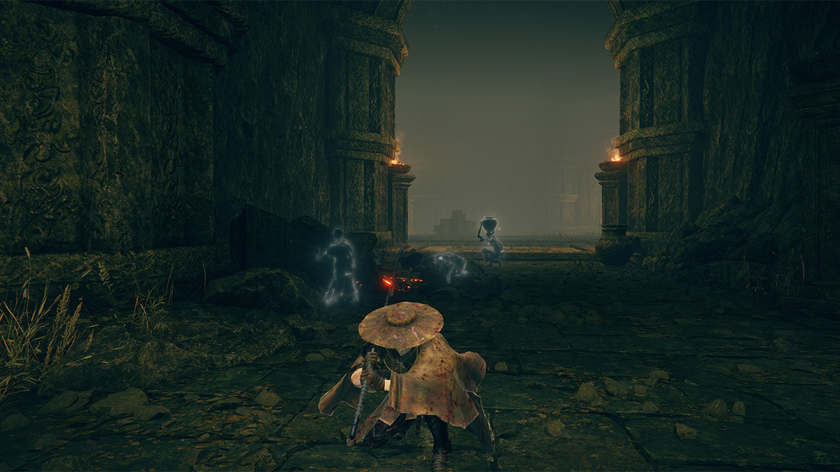 There’s only one shadow man with pots that yields a Scadutree Fragment in the Ancient Ruins of Rauh. As you progress through the level, you’ll encounter large stone doors. Take the first one past the scorpions, then when you encounter another, go through it as well. You’ll eventually encounter a pit with a spiritspring. Jump down and allow the airflow to remove fall damage.