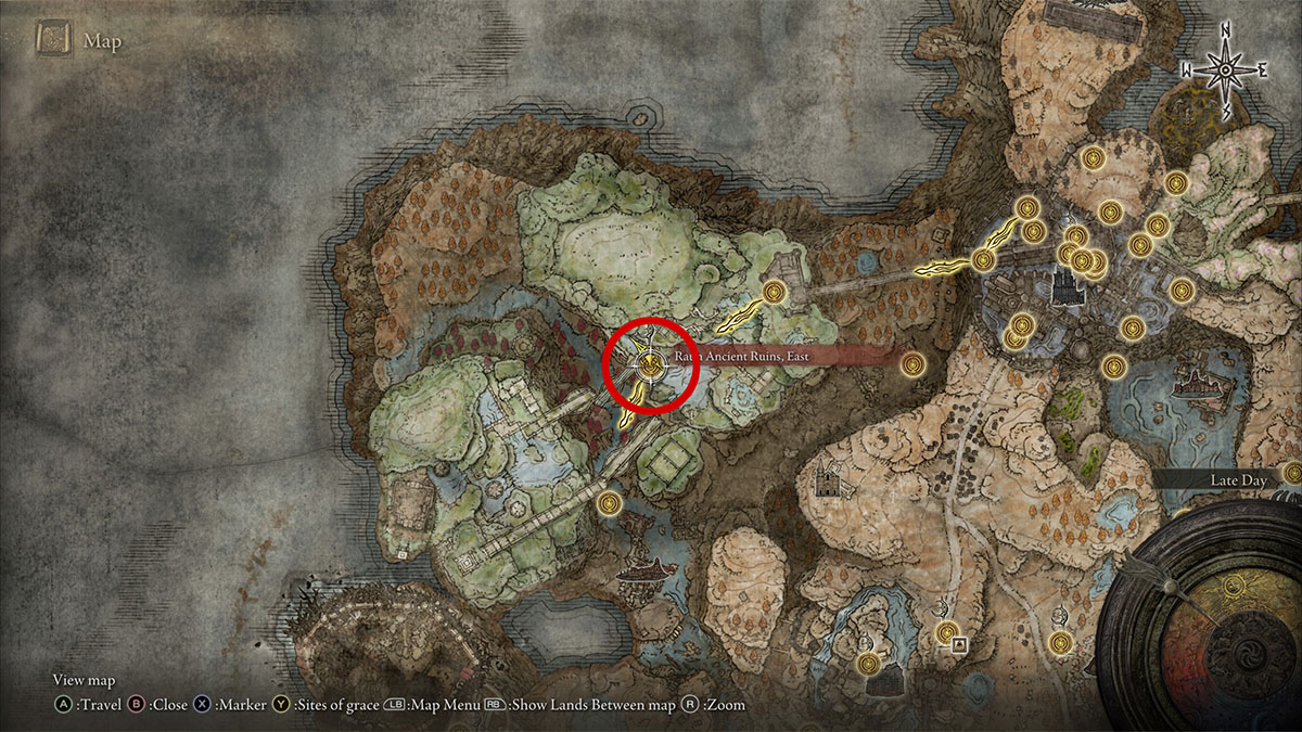 Directly east of the Highroad Cross is Moorth Ruins and Dryleaf Dane. You likely ran into it if you came north from the Fort of Repirmand, but it’s visible from the Highroad Cross as well. And like all Crosses, there’s a Scadutree Fragment there.