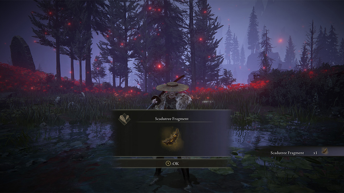 Grab the Abyssal Woods Site of Grace in this clearing, and keep going north through a smaller opening in the rocks. You’ll see several judicators wandering around there. You can either kill them or ignore them, but keep heading northwest until you see a corpse leaning against a tree. That’s where you’ll find the Scadutree Fragment.