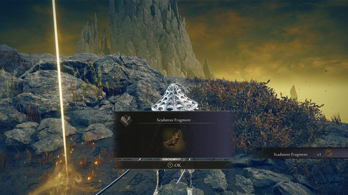 If you thought you were done hunting pot ghosts, boy, do I have news for you! There’s a second one on the Gravesite Plain, just east of the Scorched Ruins. The easiest way to find it is to pick up the Scorched Ruins Site of Grace on those ruins’ north side, then travel east toward the cliff. You’ll see another graveyard with ghostly mobs and a pot ghost who holds the Scadutree Fragment.