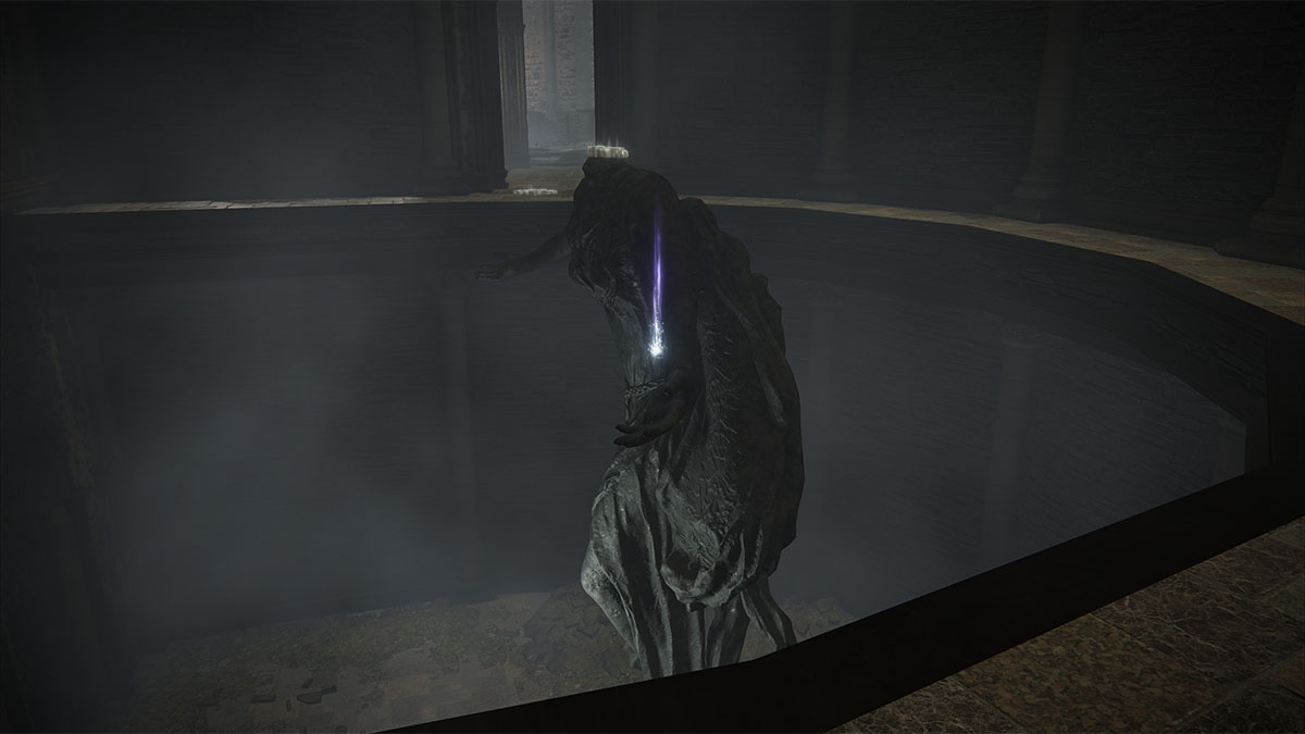 In the Church District of the Shadow Keep, you’re bound to run into a headless statue of Marika with an item on its hand. You’ll want to lower the water to make jumping over to the hand safer, then carefully hop across the small gap to pick up the fragment.