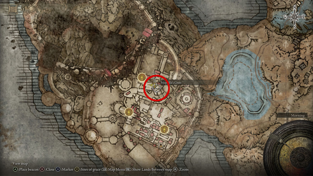 From the camp in front of Castle Ensis, take the upper path southeast through the additional soldiers and fortifications, past the Swift Spear, until you can see one of Miquella’s Crosses in the distance. This is the Pillar Path Cross, and, again, it has a single Scadutree Fragment near it, as well as the NPC Thiollier. I also like to use the Pillar Path Cross Grace as a starting point to get to the shortcut to Scadu Altus, as I enjoy fighting Rellana, Twin Moon Knight with way more power than I did on my first playthrough.