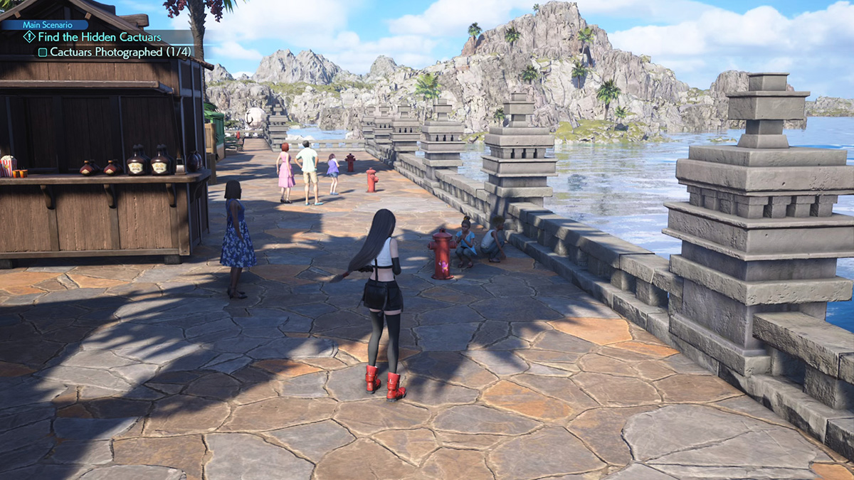The second Cactuar painting is on the waterside on the eastern side of the street near the entrance to the town. Specifically, you’re looking for a fire hydrant near some children and behind a vendor shack. Your required zoom value here is 30%, so get up real close to the hydrant and snap a pic of the Cactuar.