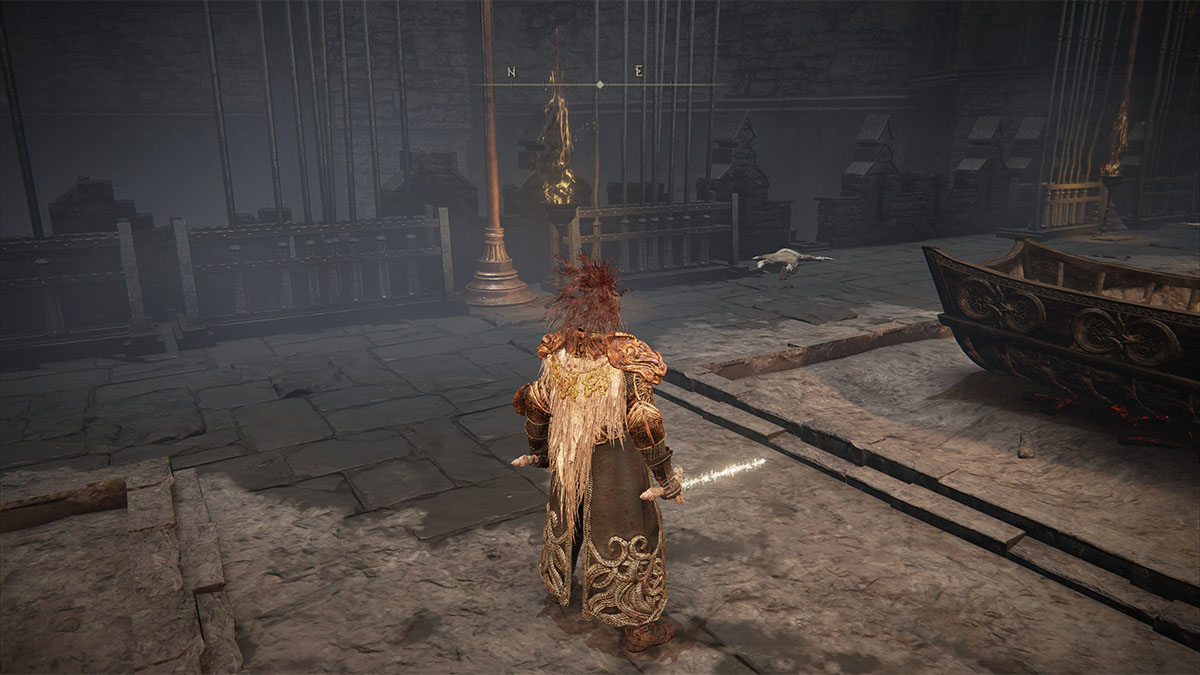 The first stop on your quest to the hidden coffin is on the rampart northeast of the Golden Rhinoscerous fight. If you start there, make your way west along the outer wall of the keep until you reach the bridge leading deeper into Specimen Storage, but instead of engaging the Fire Knight, continue east onto the rampart. You’ll see a corpse with an item on it and if you look closely, near that corpse is a ladder. Take it down.