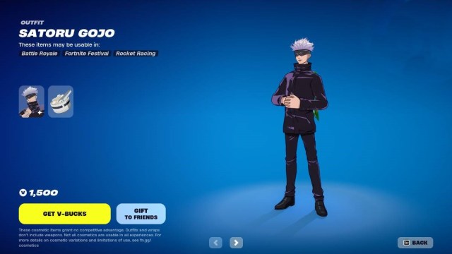 - Includes: Satoru Gojo skin, Sweet Selection back bling.