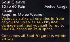 - Shear – Generates 10 Pain and has a chance to generate a Lesser Soul Fragment that lasts for 20 seconds.
