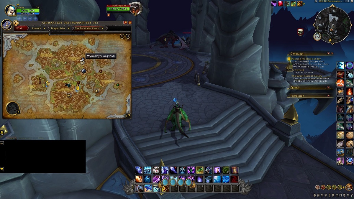 Wyrmslayer Angvardi might be the most difficult Rare to reach simply because of how high you have to go to get to him. He’s on top of the tower at (62, 31). He also seems to have the longest respawn timer among the Rare Bosses on the Forbidden Reach.