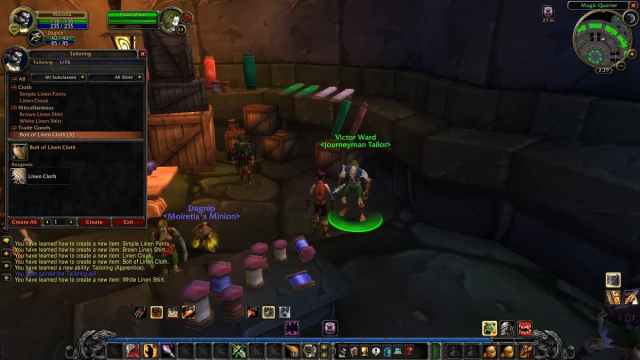 The Coarse Thread is sold by the Tailor Supplies vendor or a general Trade Goods vendor. The Bolts, however, you have to make. To do so, you’ll use two pieces of Linen Cloth to craft one Bolt. So, you need a total of six Linen pieces for one Linen Bag. This recipe is available when you learn Tailoring, so you can craft Bolts of Linen Cloth to level your profession to 45.