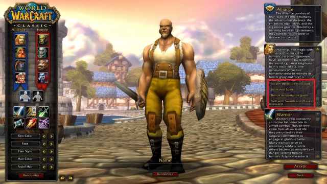 Every race can be a Warrior, but for the Alliance, Humans have weapon specializations that are more useful than other racial options you have access to. The Spirit bonus can be useful for health regen between fights so you don’t go through so many food items or bandages.