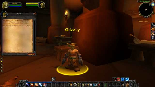 When you try to talk to Grizzby, he’ll tell you to “come back once you’re a bit more important” and he suggests that you can’t afford his services. This is a hint that you must gain enough gold before he opens up his wares to you. Of course he wouldn’t be impressed by my measly 14 Silver. I don’t blame him. Since all his wares cost five gold apiece, I imagine you’ll likely need more than that to convince him to speak with you.